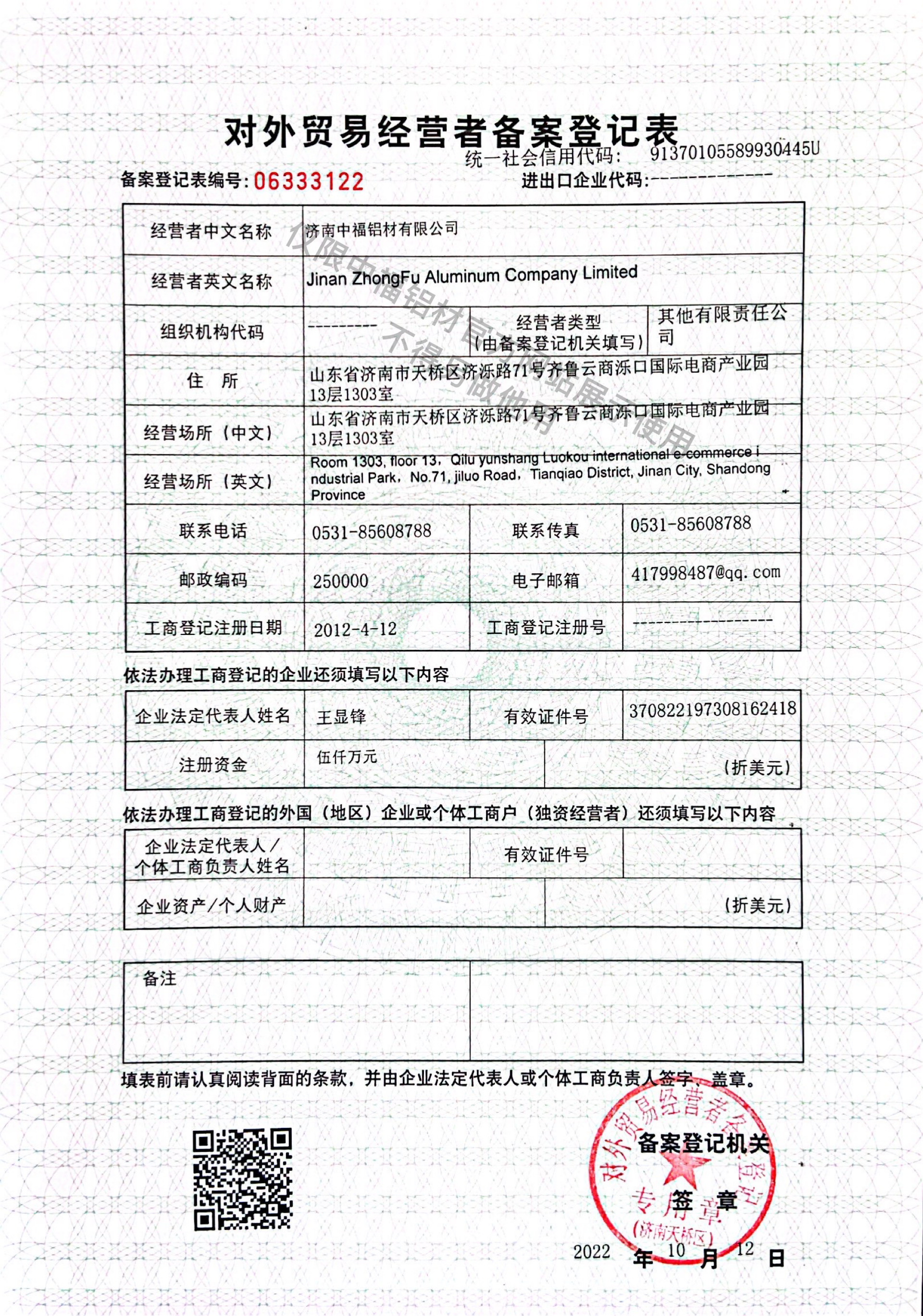 联系人:李经理 邮 箱:jackwang@zhongfualuminum.cn 电 话:15610103558 地 址:济南市天桥区齐鲁云商国际产业园13层